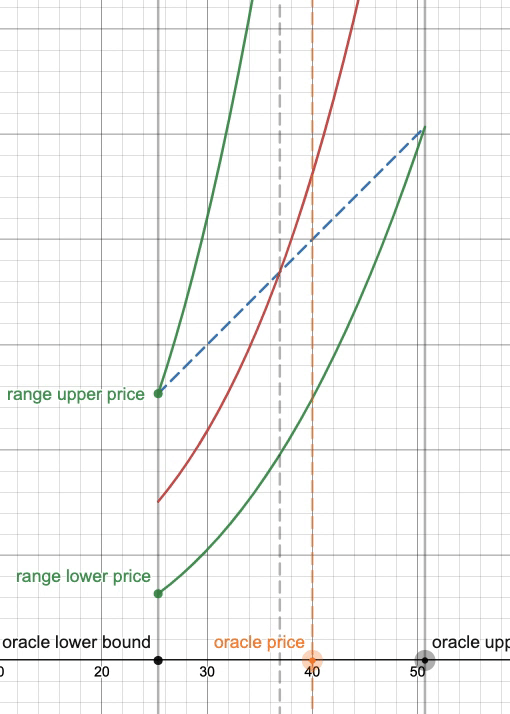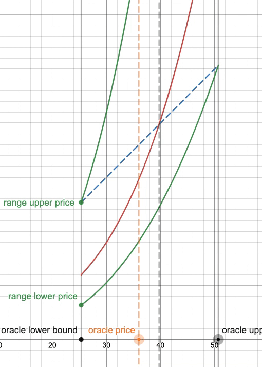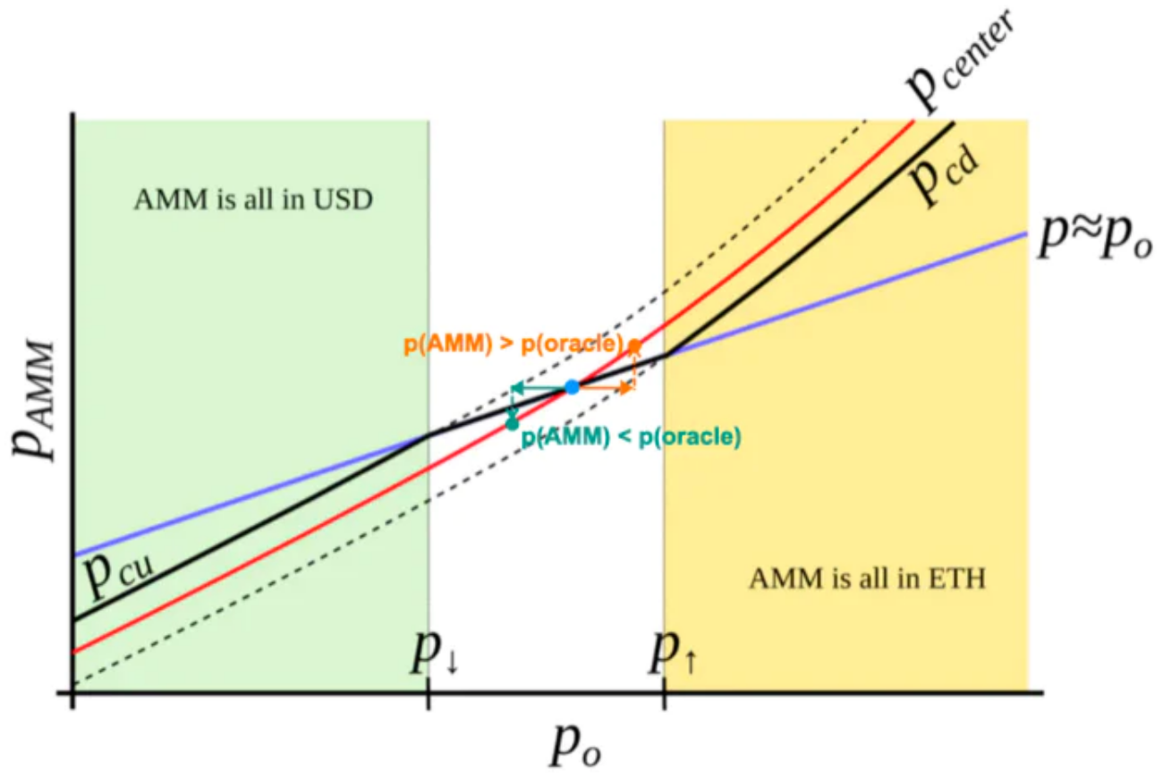 中间的紫色线表示P_ORACLE的价格变化,红色线表示P_AMM的价格变化。P_CD和P_CU可以被认为是两个方程,用于找到这个区间的上下限价格。
