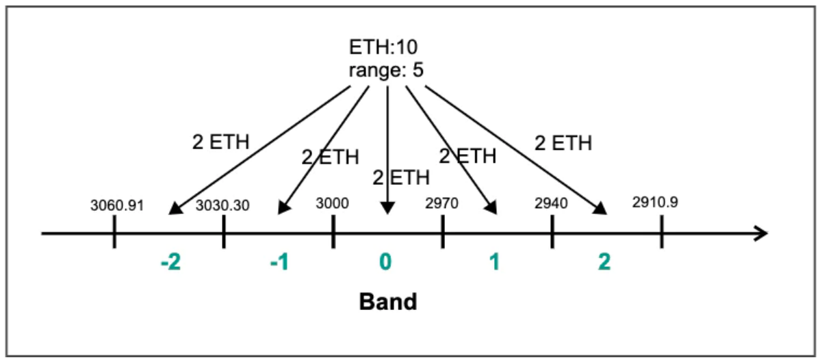 抵押品将根据要存储的波段数量被分成相等的、均匀的小块,然后根据当前价格和铸造的crvUSD,存储在由波段组成的连续价格区间中。下图是计算后将10个ETH存储在5个波段的分布情况,其中5个小块,每个2个ETH存储在5个连续的波段。
