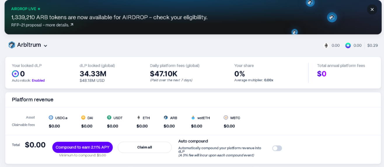 可以看出,2.21/(13.92*67%)=23.7%,即只有23.7%的贷款收入分发给了存款人,而剩下72.3%的收入,分发给了DLP的提供者。近7天协议日均收入约4.7万美元,对应的年化收入是1715.5万美元,这部分都是以USDC、ETH、ARB、BTC形态发放的真实收益。
