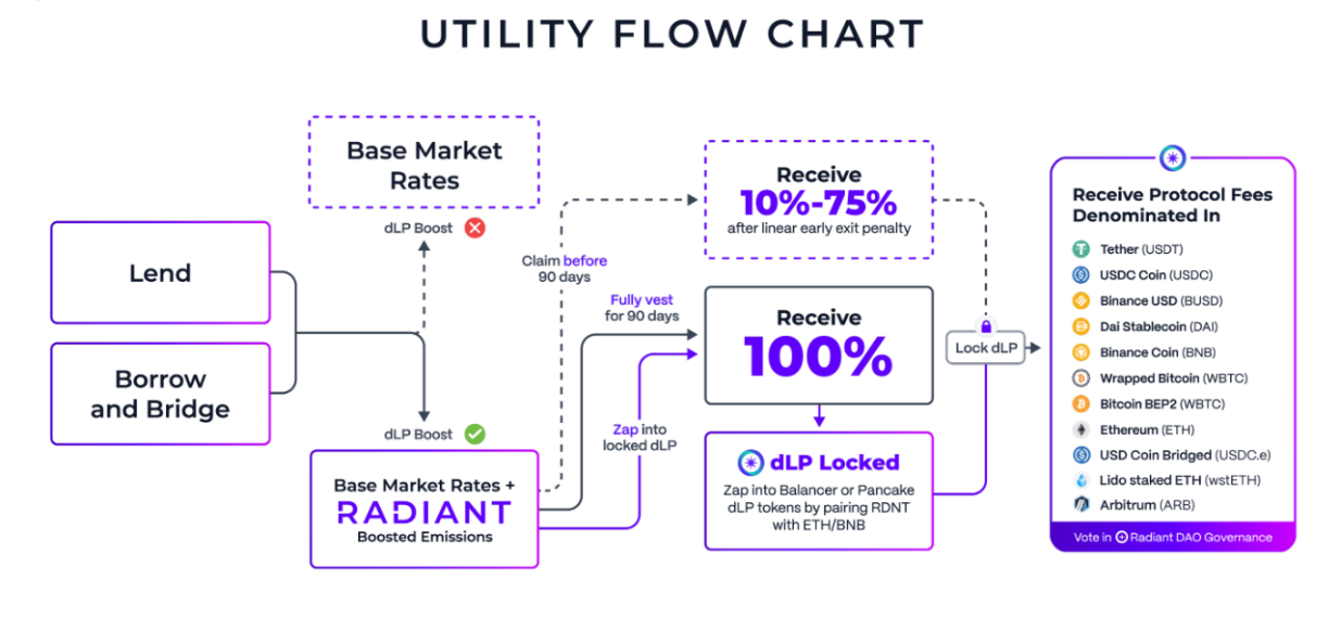 到这里前面一个问题又得到了反转,如果我存100U4倍杠杆参与RDNT挖矿,虽然协议一年要收我一年24.98U的借款费用,但这部分费用又会被分配给DLP池,就会形成一个有意思的事情,我挖RDNT,RDNT挖我的USDC,DLP又挖RDNT的USDC,我又挖DLP,所以结果是:我挖我自己?