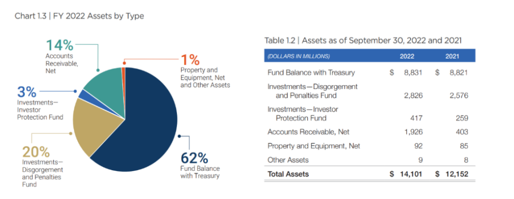 接下来来看一下SEC的资产负债表。按照2022财年年报,SEC的总资产从122亿增长到了141亿美元,增长19亿美元。其中投资科目增长了4亿美元;应收账款增加了15亿美元,这两项的绝大部分都是由罚没收入构成,其中投资科目还已经扣除了监管过程中的支出。