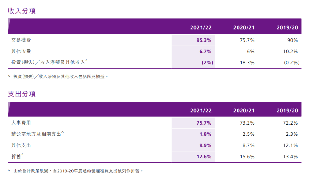 收入和支出方面,SFC的构成非常简单,2021-2022年度SFC总收入为22.47亿港元,其中【交易徵費】占到95.3%,其它收入为6.7%(主要向市场参与者征收),罚没收入并没有出现在SFC的收入分享当中。支出中,由75.7%为人事费用。按照该年报数据,截至2022年SFC一共有913名雇员。