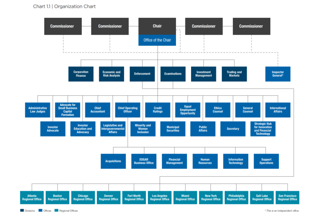 首先我们来看一下SEC的架构,最上面是包括主席+4名委员构成的委员会,下设6个部门+1个监察长办公室+11个办公室。除此以外,还有11个分地区的办公室。需要注意的是,这11个地区办公室需要同时向执法司(Enforcement)和检查司(Examinations)汇报。