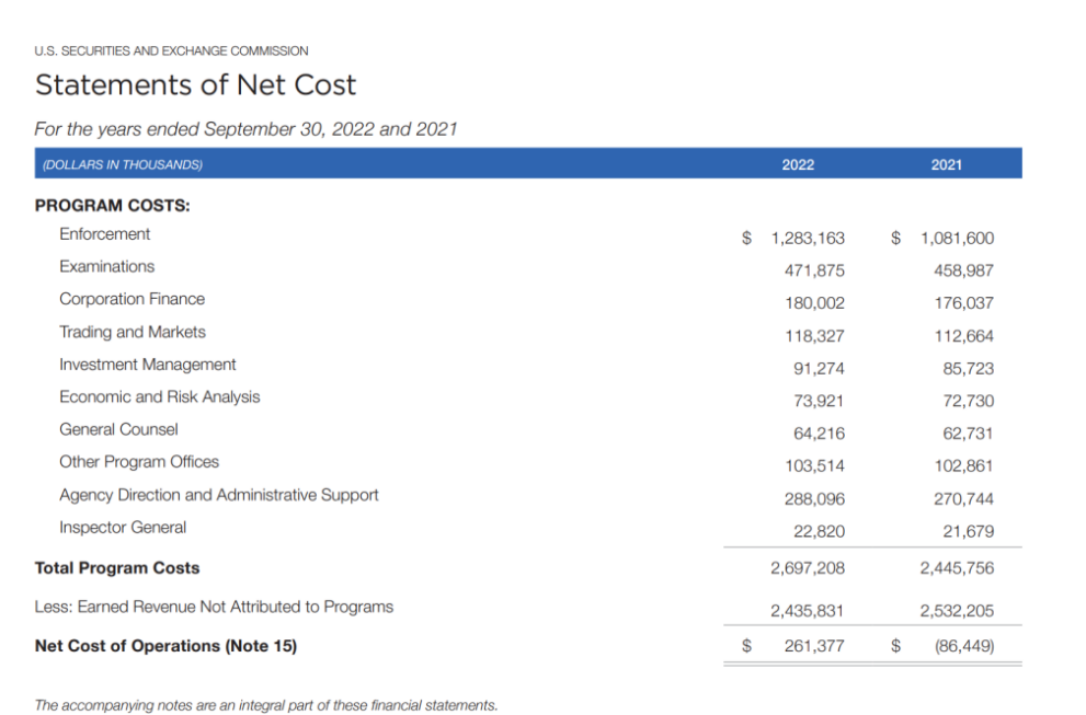 看完收入再来看支出,可以看到执法司和检查司的净支出是最高的,合计达到了17.5亿美元,占到总支出的65%。这些支出最终转化为了执法行动:根据SEC的另一篇公开文章,SEC在2022财年总共提起了760起执法行动,比上一年增加了9%。其中包括462项新的或“独立”执法行动。