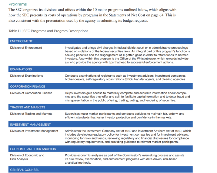 从组织架构上我们就可以发现,执法司(Enforcement)和检查司(Examinations)似乎在所有科室中是最重要的。在后面的各部门描述当中,我们也可以看到执法司和检查司也分列一二。