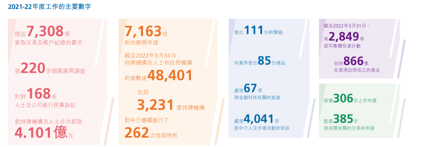 依据SFC2021-2022年年度工作摘要,SFC全年共展开了220项个案调查,发起了168起民事诉讼,对持牌机构和个人合计罚款4.101亿港元。除了执法以外,另一个重要数据是该年度SFC收到了7163件牌照申请;通过WING处理了超过38000件牌照资料审核。