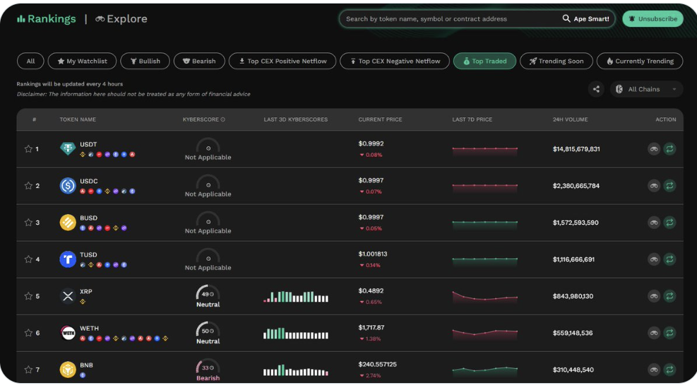 KyberAI 为交易者提供跨链的链上和链下技术数据,帮助他们做出明智的交易。它支持 7 条链上的 4000种 代币。