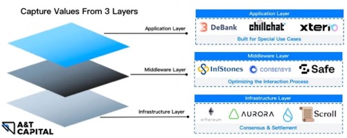 - 在各个技术层,都能看到web3带来的革新,应用层为用户打造专门场景,中间层优化交互过程,基础设施层优化共识和结算。