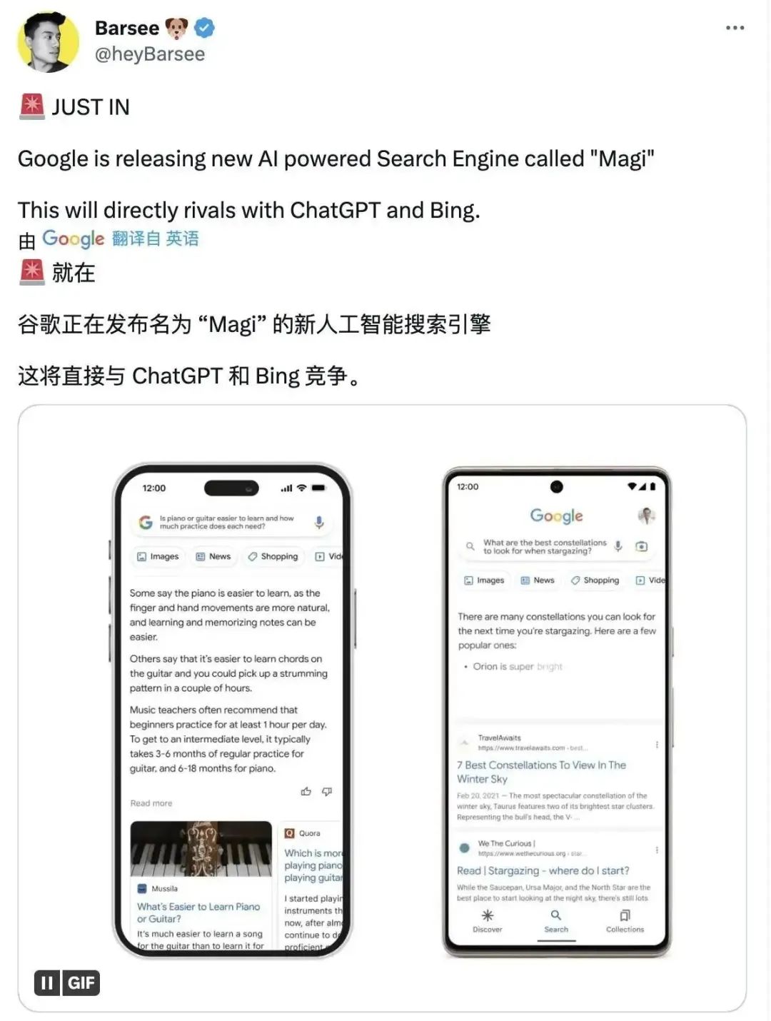 要说 Bard 更像是一个「仓促」的回应,是对外界展示 Google 并未在 AIGC 上落伍的话。你这个新搜索的 Magi 项目,可能才是 Google 面对 OpenAI 和微软严肃的一次反击。也可以说,Google 终于下定决心,重建搜索引擎。