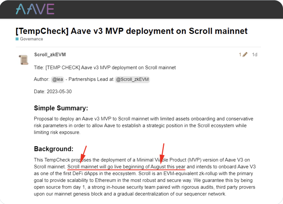 此外,Aave 提案中也提到了 Scroll 主网将于 8 月推出,所以尽快行动无疑是明智的。