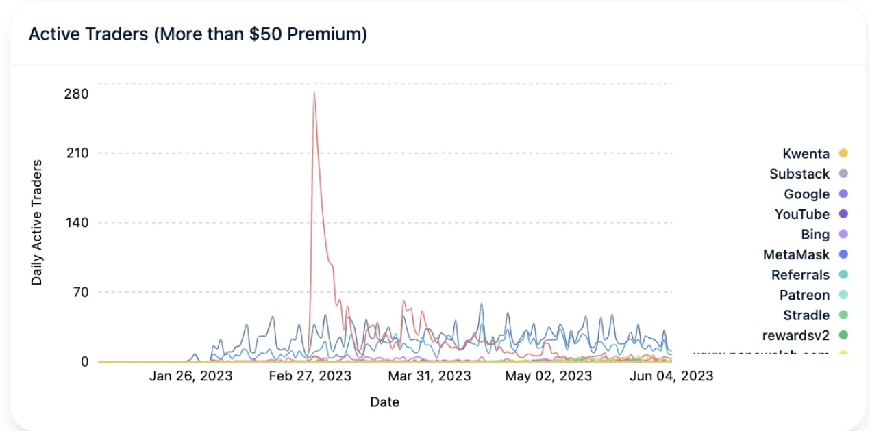 在这个案例研究中,去中心化期权交易协议 Lyra 已经使用 Spindl 来衡量他们从所有渠道获得的用户留存和货币化情况。尽管 Web 3 市场营销还处于初期阶段,但它已经是“全渠道”营销,因为营销人员使用多种策略并行运作,并进行并列测量。如果一个渠道在归因仪表板中没有出现,从营销人员的角度来看,它基本上就不存在。在这里,我们可以看到由那些生成超过 50 美元期权保费(Lyra 的唯一活跃用户定义)的用户衡量的 Lyra 的入站渠道。