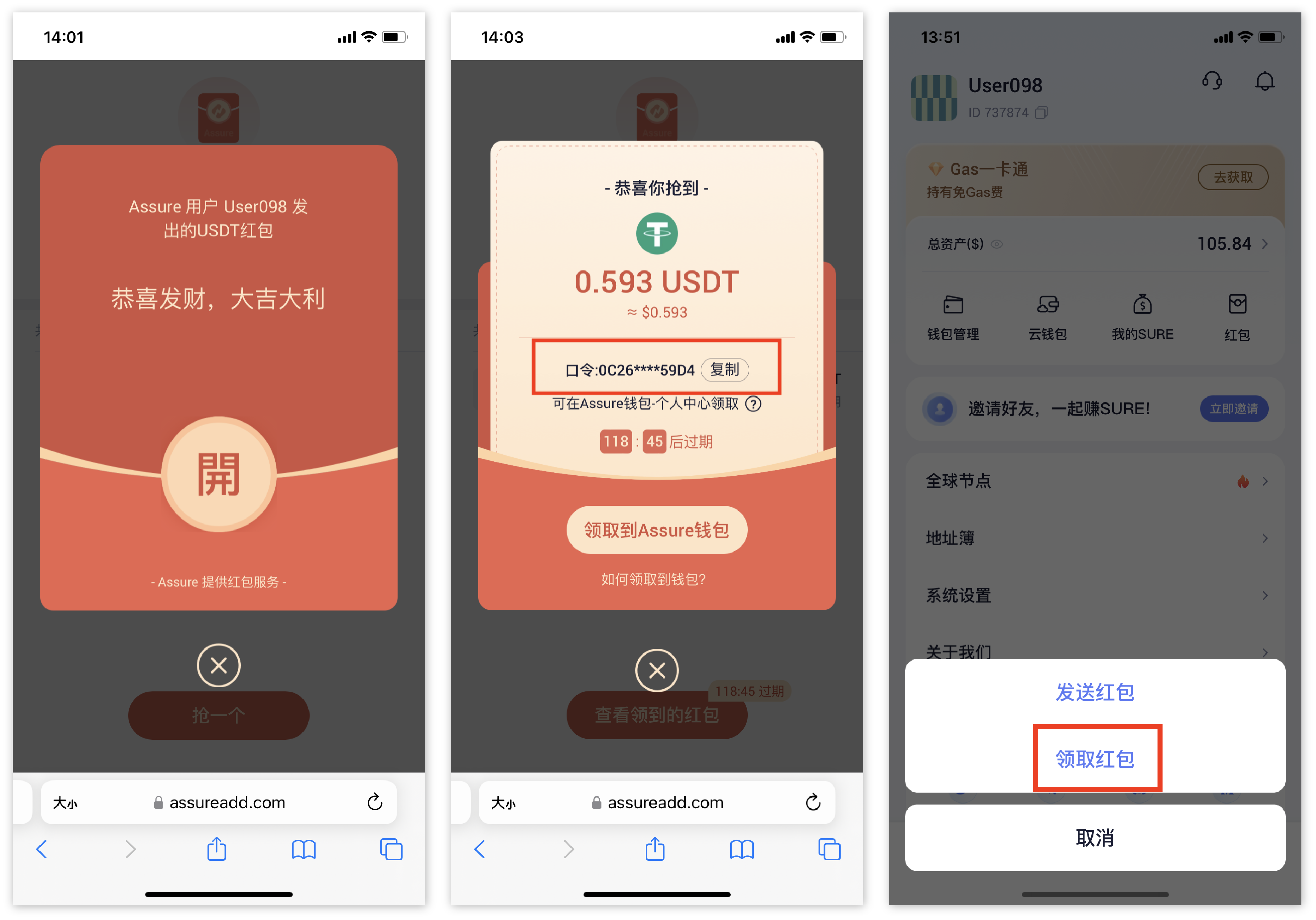 好友收到红包后,复制口令,再前往Assure钱包中输入口令激活红包,领取红包金额。若未在规定的时间内激活红包,红包将会失效。