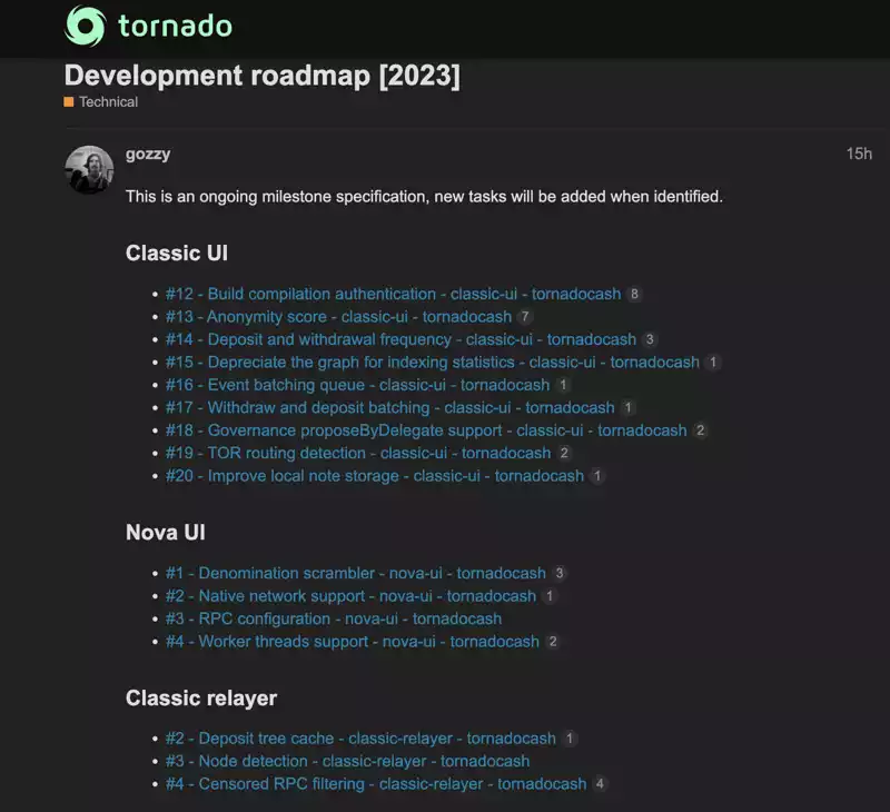 提案通过的第二天,gozzy 就开始更新用户使用 ENS 和 IPFS 解析器(http://3th.ws)登录网站的使用方法,同时发布了部分 Tornado Cash 路线图。从路线图中能看出,gozzy 目前的首要任务是恢复 Tornado Cash 的前端以及中继器的连接。后续还要更新教育资源、参与并加速治理、完成协议的扩展开发等等。