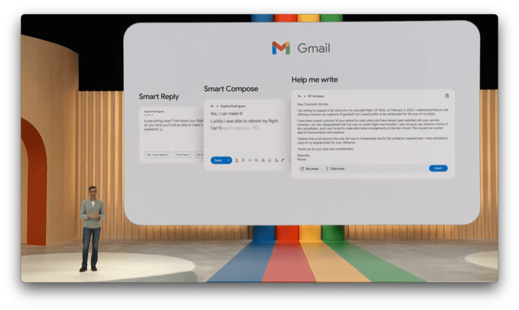 我在上面提到过,谷歌将谷歌照片介绍为照片的Gmail;在Pichai的开幕词中,我最喜欢的两张幻灯片显示了这两种产品是如何证明谷歌不断发展的AI能力的。Gmail从 "智能回复 "到 "智能撰写 "再到 "帮助我写作":