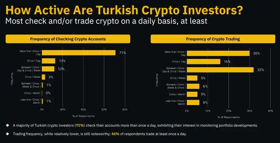 而在用户习惯上,7 成以上的加密资产投资者每天打开自己的账户一次,其中 3 成以上的人则会每周交易一次。这种行为习惯也符合我们自己的认知,币圈一天人间一年,大陆另一头的土耳其用户们也是如此。