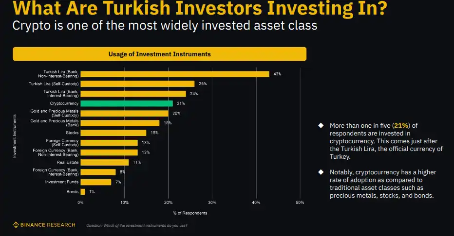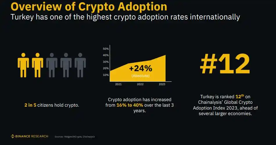币安的报告显示,每 5 个土耳其居民重就有 2 个持有加密资产;过去 3 年间当地的加密接受度从 16% 飙升至 40%。