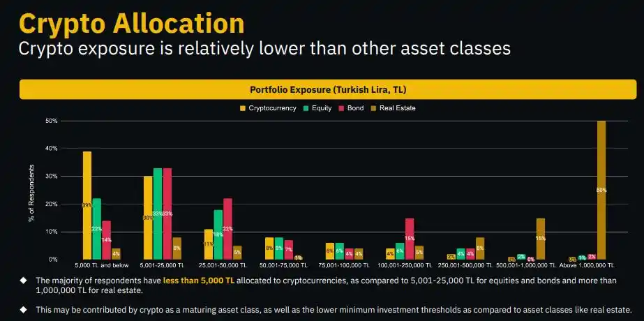 在金额分配上,大部分用户投资加密货币的金额在 5000 里拉以下,与此相比他们投资房地产的金额则在 100 万里拉以上,投资传统债券的则在 25000 里拉左右。