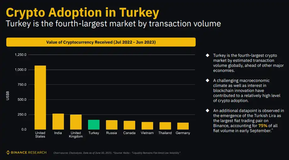 此外,一个冷知识是,土耳其是全球第 4 大加密资产交易市场,其加密资产交易量显著高于世界上其他几个大经济体。而币安的内部交易数据也显示,在今年 9 月初,土耳其的里拉(当地法币)一度高居整个交易所法币交易对的榜首,占比达到了惊人的 75%。