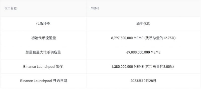 - 截至 2023 年 10 月 27 日,MEME 的总供应量为 69,000,000,000,上市后的流通供应量约为 8,797,500,000(约占代币总供应量的 12.75%)。
