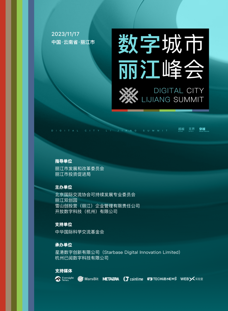 11 月 17 日,由丽江市发展和改革委员会、丽江市投资促进局指导,北京国际交流协会可持续发展专业委员会、丽江双创园、雪山创投营(丽江)企业管理有限责任公司、开放数字科技(杭州)有限公司共同主办,中华国际科学交流基金会支持举办,星港数字创新有限公司(Starbase Digital Innovation Limited)、杭州已阅数字科技有限公司联合承办的数字城市丽江峰会在丽江顺利举行。丽江市人民政府、丽江市发展和改革委员会、丽江市商务局、丽江市住房和城乡建设局、丽江市投资促进局、 世界文化遗产丽江古城保护管理局、古城区发展和改革局、古城区文化和旅游局、玉龙县文化和旅游局、丽江双创园、北京国际交流协会可持续发展专业委员等部门和单位代表出席活动。