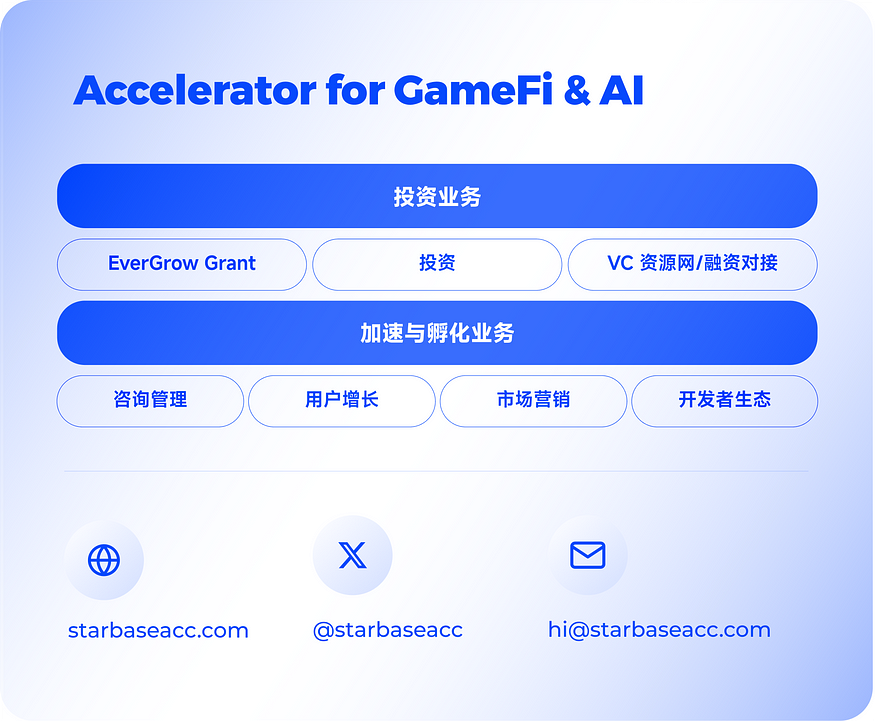 Starbase 是一家专注 Web 3.0 领域的加速器,针对初创企业在商业化过程所产生『应用场景』、『资金资产』、『用户增长』的三大需求,提供平台化的加速支持。团队自 2018 年成立以来已与上千个成熟项目和机构展开了深度合作。游戏赛道是 Starbase 重点关注和布局的版图, 已针对优质链游项目推出一系列用户增长、产品设计咨询、市场策略、投融资等加速服务。