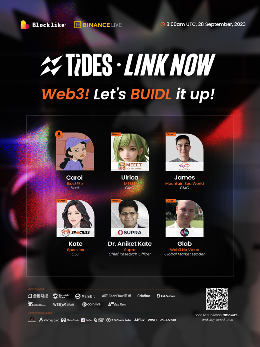 9 月 28 日,Blocklike 开展了第二十四期「即刻链接」币安直播活动。本次活动以「Web3! Let's BUIDL it up!」为主题,邀请了 5 个 Web3 团队进行分享,分别是 MEEET、Mountain Sea World、Speckies、Supra、Web3 No Value 。