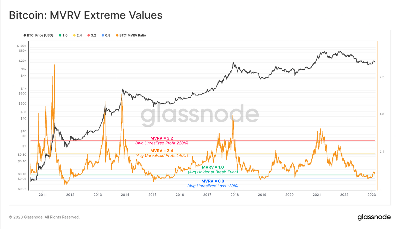 - MVRV为0.8表示价格是实现价格的0.8倍(-20%的损失)。