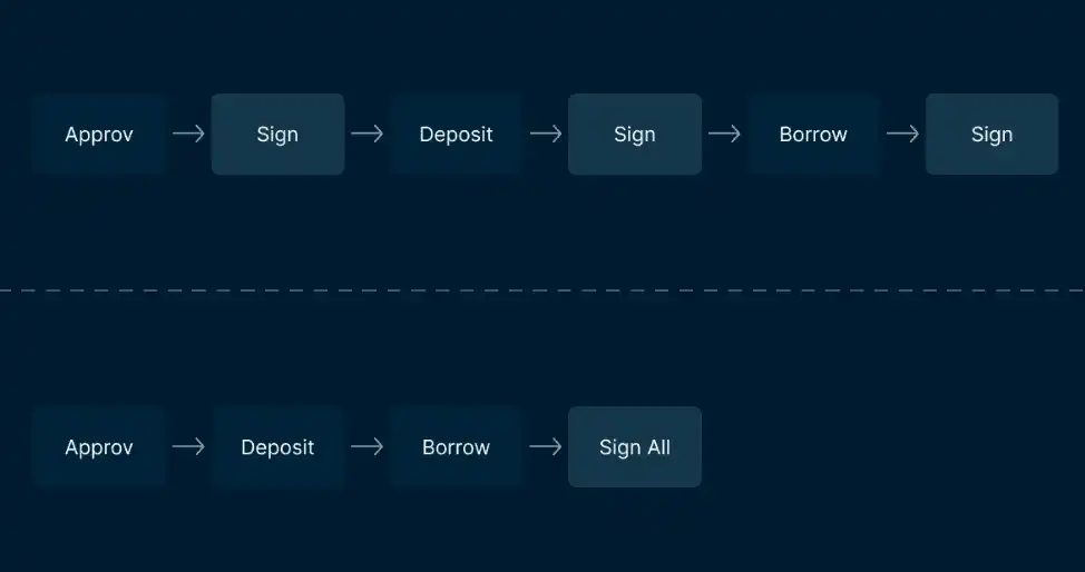 在以太坊上使用 dApp 是令人沮丧的,因为每个链上交互都需要交易 (以及 gas 费)。这是糟糕的用户体验。通过帐户抽象,可以将多个交易捆绑在一起。下图显示了它将如何极大地改善用户体验: