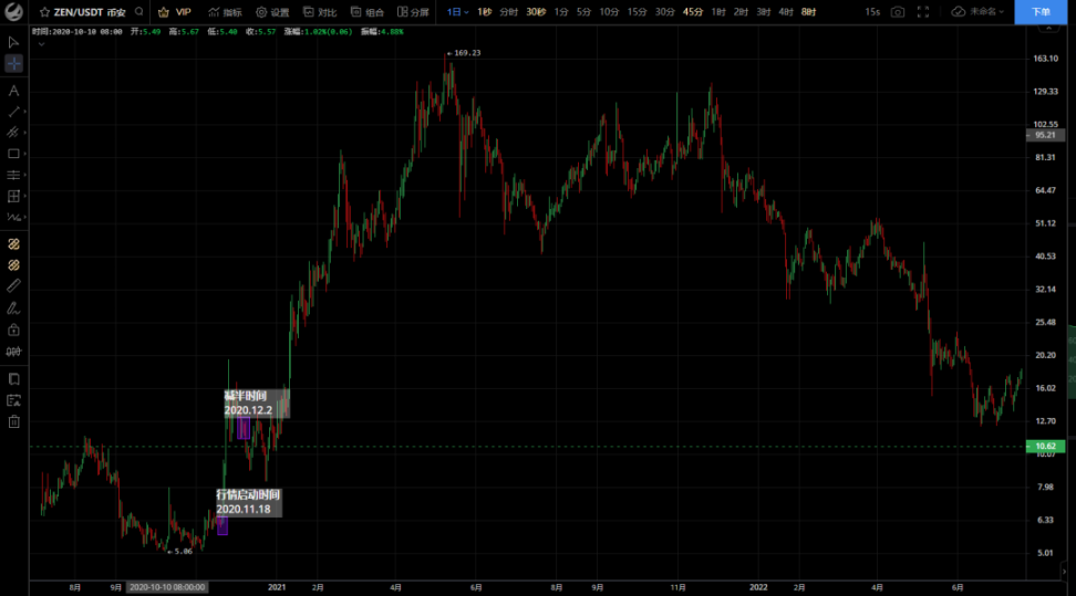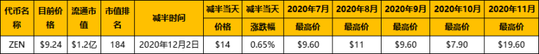 (1)以上数据可以看出,ZEN 的减半月表现较差,减半前 5 个月的价格涨幅波动并没有很大,减半后伴随 BTC 的上涨行情也开始上涨,在 2021 年 5 月 8 日,达到新高 $169,距离减半完成时间间隔近半年时间,直到目前再没有突破新高。