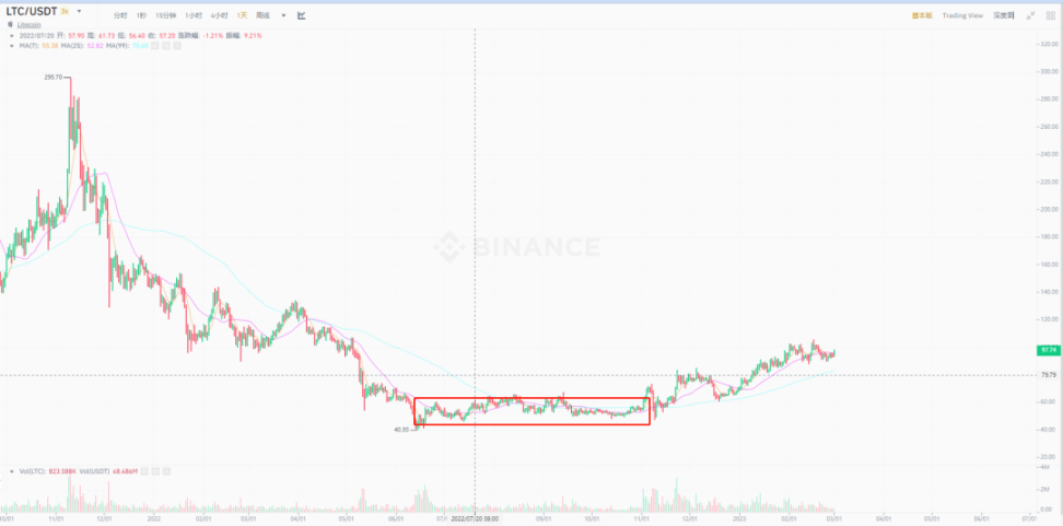 (2)从 K 线图可知:LTC 围绕 55-60 左右的价格近半年时间,底部构造比较充足,是最佳的买入点,现在回头看随着市场的炒作以及 2023 年年初的行情,已经翻了快 1 倍,相比上一次减半,LTC 直接从 2018 年 12 月的 $22 上涨到 2019 年 6 月 $146U,上涨了 6 倍以上,预计 2023 年 6 月份行情结束前,还有 2-3 倍的空间。