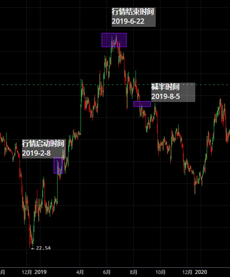 (2)历史上,比特币已经经历了 3 次区块奖励减半,(因 AIcoin 展示的 K 线为 2017 年之后,以下通过文字叙述行情变化)
