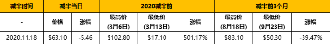 (1)目前,ETC 已经完成了 3 次减产,每次的减产幅度是 20%,第一次减产,是在 2017 年 11 月 3 日底部开始上涨,12 月 20 日达到最高点;第二次减产之前,加密资产市场发生了「3·12」暴跌,ETC 在减产前 40 天内由最高 $13.2 跌至最低价 $3.1,跌幅是 -329.97%;第三次减产是在 22 年的 4 月 25 日,从 3 月 16 日至 29 日间,ETC 从 $25.6 美元上涨至最高 $52.66,涨幅达到 105.7%,成为当时为数不多表现亮眼的项目,即将到来的减产显然是这次上涨的催化剂。总体表现看,ETC 在减产前的 30-40 天就有一次波段行情。