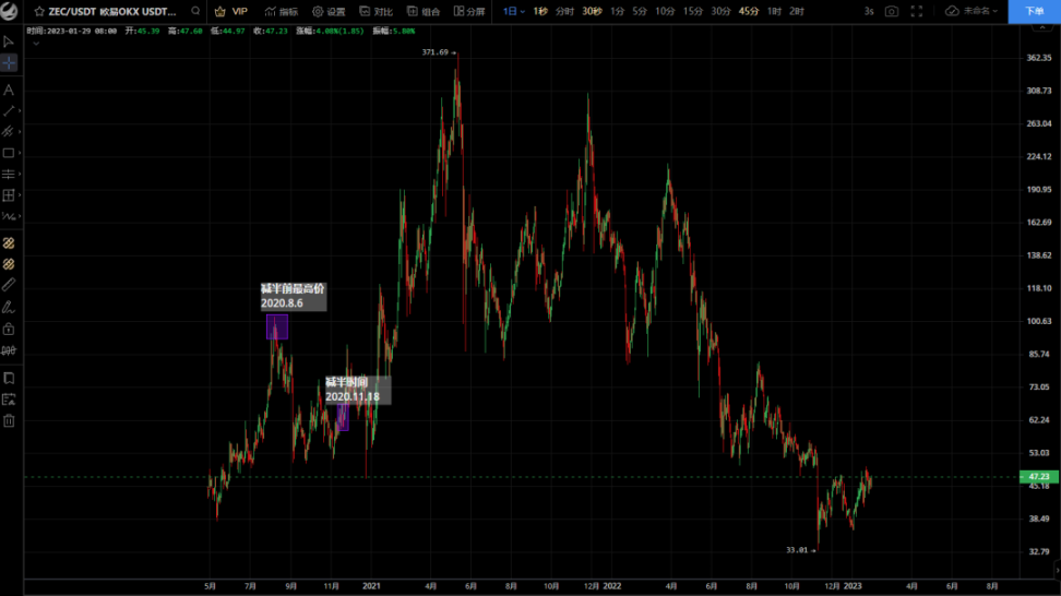 (1)2020 年初至减半期间,ZEC 最高涨幅达到了 501.17%,在隐私 Token 中,整体涨幅较优,但是近减半的 3 个月来看,ZEC 下跌了 39.47%,同时在近一周和近 24 小时,ZEC 也只是跟随大盘,并未走出自己的独立行情,总之减半后,ZEC 价格并未有明显的上涨趋势,直到半年后,也就是 2021 年的 5 月牛市期间达到最高点 $371。