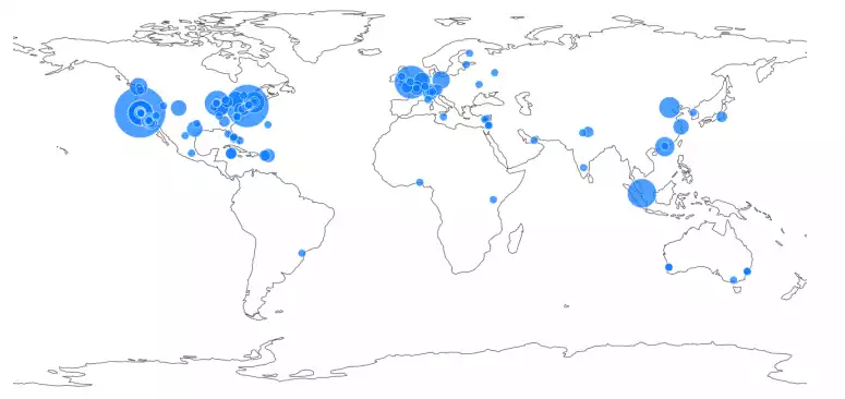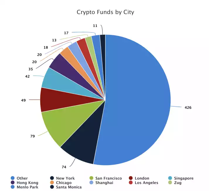 但当我们把目光放到城市上时,这个现象会更加明显。根据 Crypto Fund Research 数据,旧金山和纽约拥有世界上最多的加密基金 (>70 家),而伦敦、新加坡和香港以 30-50 家加密基金的数量位居其后,芝加哥、上海、洛杉矶、瑞士楚格、加州门罗帕克和圣莫妮卡则处于 10-20 家加密基金的第三阵营。在地图上也能清楚地看到,加密基金在美国东西部沿海和西欧较为集中,部分位于东亚和东南亚,其他则分布在东欧、西亚和澳洲,而非洲与南美只有零星几家。