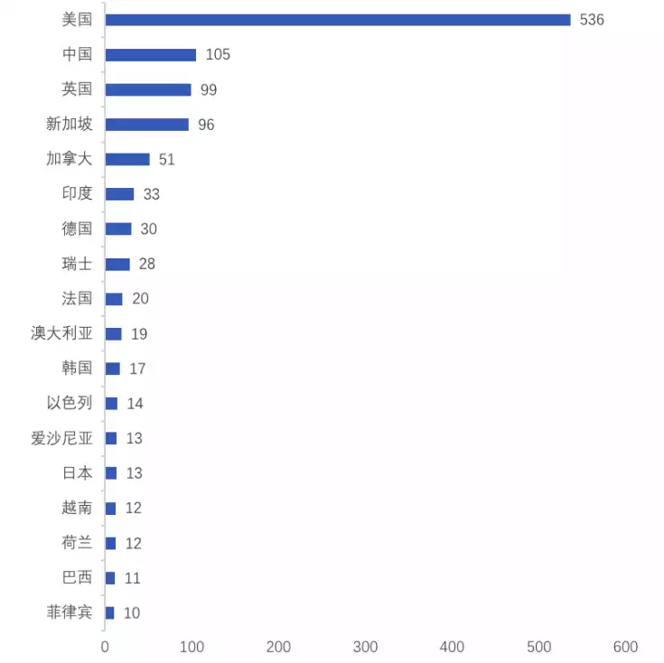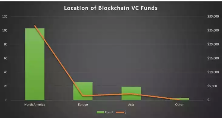 加密行业在各国的发展除了与当地政策密切相关,同时还受到该国经济水平的影响。当我们以潜在投资额为对象来看时,根据 Hutt Capital 数据,目前,位于北美的加密 VC 基金在数量 (68%) 和平均资金量 ($259m/87%) 上都是遥遥领先的。虽然欧洲加密 VC 基金数量相比于亚洲更多,但是资金量上亚洲加密 VC 基金 ($120m) 比欧洲 ($61m) 要占优一些。而资金量超过$500m 的 14 家加密 VC 基金里,有 13 家在北美。由此可见,整个行业的资金来源主要还是在北美,直白一点的话,应该是美国。