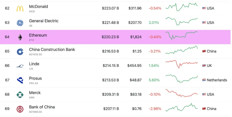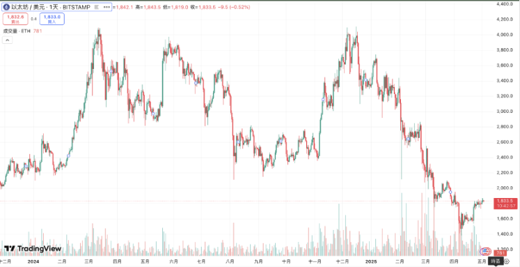 截至 2025 年 5 月 2 日,以太坊市值约为 2200 亿美元,较 2024 年 5 月 1 日的 3620 亿美元下滑了 39% ,显示其在过去一年内显著承压 。更进一步,较 2024 年 12 月 31 日的 4014 亿美元高点来看,其市值已大幅回落 45% 。
