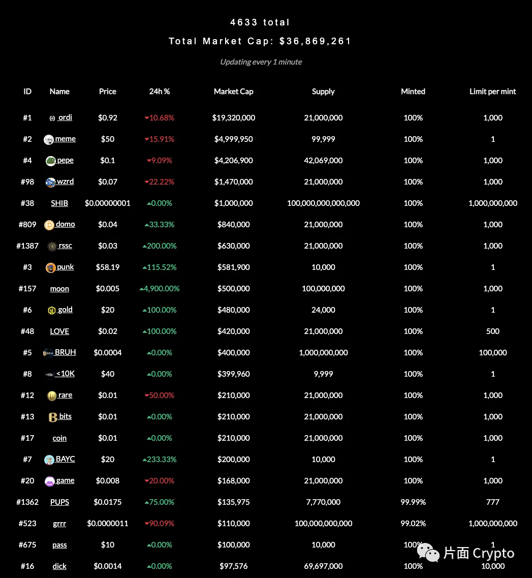 第一个 BRC 20 的币,ORDI 总量 2100 万个,现在单价已经超过了 1 美元(截图的时候跌下来了,之前是 1 美元,很久之前一直是零点几),其他的币价格和市值在这个网站都能看到。