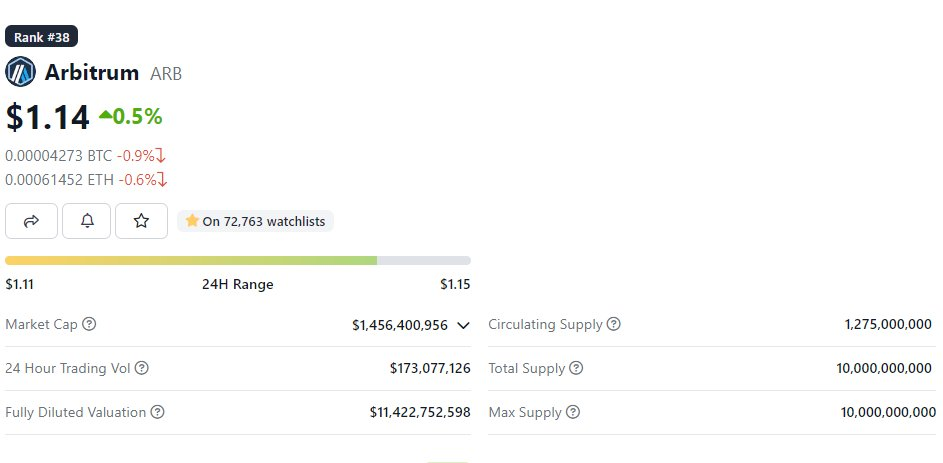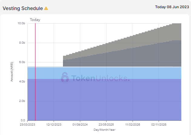 代币解锁可能会非常缓慢。以$ARB(Arbitrum发行的代币)为例,在纸面上,它看起来并不理想:只有13%的总供应量在流通,目前的估值已经达到15亿美元。这意味着按照今天的价格,它的价值很快将达到110亿美元。然而,价格一直非常稳定,因为下一个代币解锁计划在初始发布后整整一年。这意味着在这一年内,没有太多可担心的事情。有些项目甚至有更长的锁定时间。