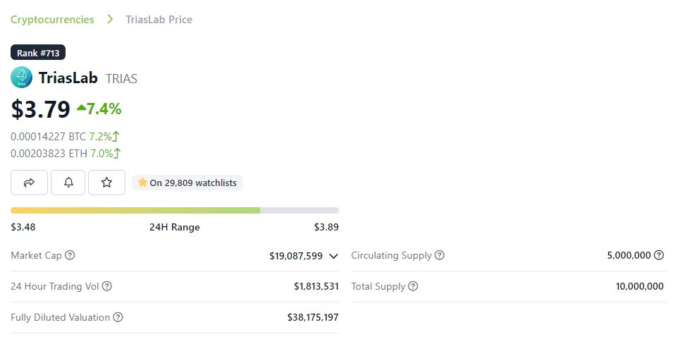 以$TRIAS为例,目前市场上解锁了500万个代币,总供应量为1000万。这意味着目前解锁了总供应量的50%,也就是说,完全稀释后的价值只是现在价格的2倍。