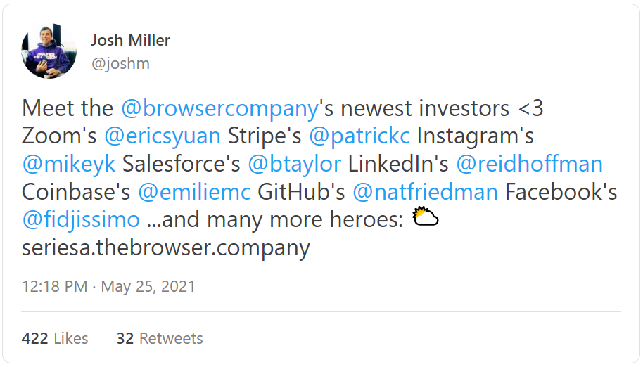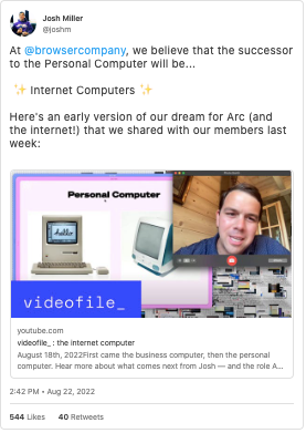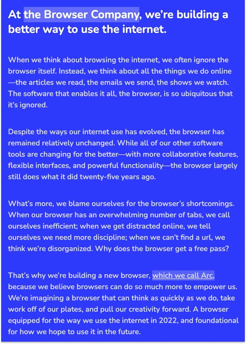 但是,当浏览器公司的首席执行官Josh Miller联系我,感谢我对Arc的赞誉,并提出要解释公司的远大愿景时,我接受了他的建议,在我们的电话中,大约三分钟后,我知道这篇文章将比Arc更有意义。