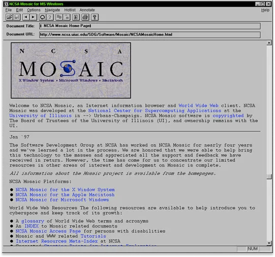 1993年1月23日,伊利诺伊大学厄巴纳-香槟分校国家超级计算应用中心(NCSA)的两名学生Marc Andreessen和Eric Bina发布了第一款用户友好的网络浏览器:Mosaic。