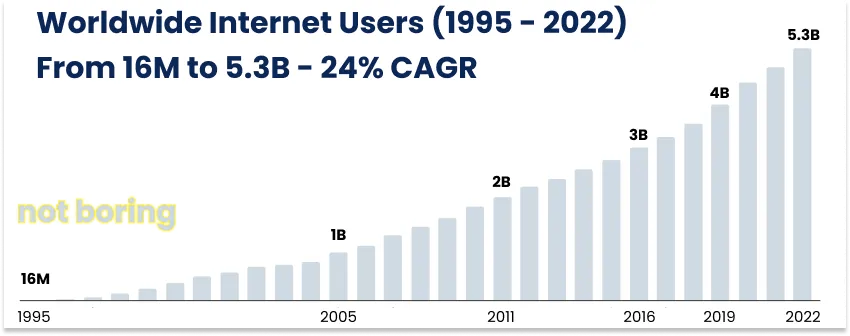 它一炮而红。六个月后,它拥有超过了10万用户。到年底,它达到了100万,浏览器市场份额达到了90%。更重要的是,浏览器揭示了网络效应:随着更多的用户在信息高速公路上冲浪,更多的人和公司创建了网站供他们使用。更多的网站吸引了更多的用户,等等。这是互联网时代的常见模式。