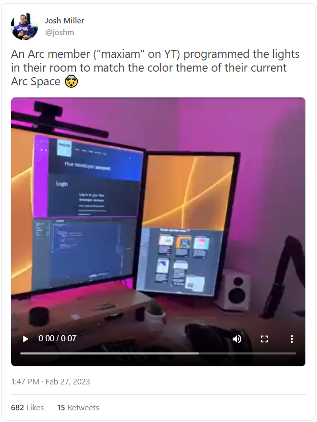 一位用户甚至为他们房间的灯光编程,以配合他们目前所在的任何一个Arc空间的颜色主题: