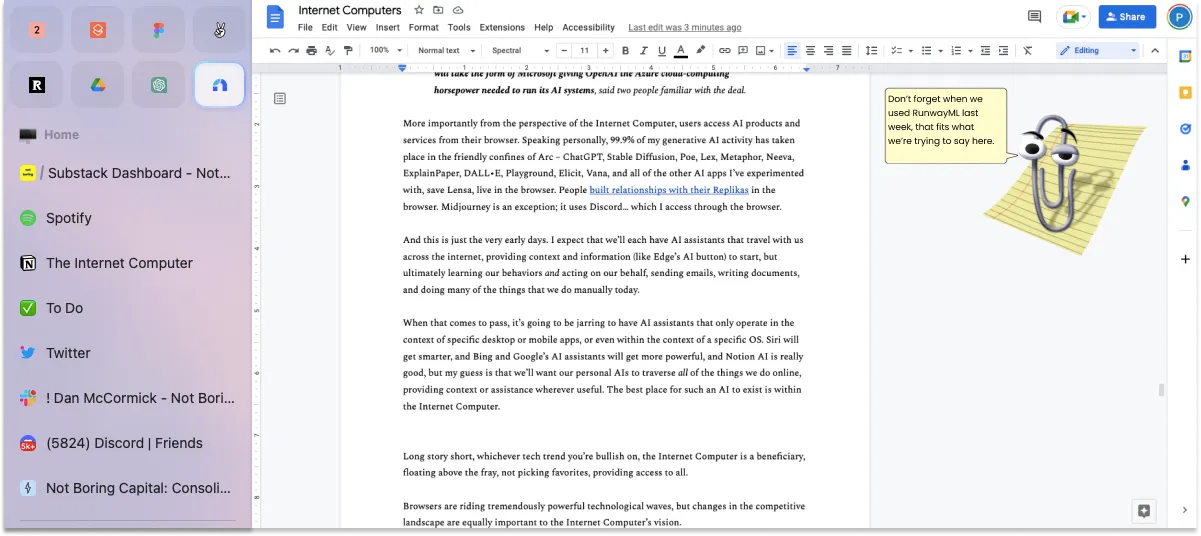 我想我们现在可能正处于这样的时刻。在人工智能的推动下,巨头们再次发出了在浏览器中作战的信号。但是,我当然支持这个处在劣势的最新产品:浏览器公司。他们的互联网计算机,我希望当尘埃落定时,每个人都在使用。