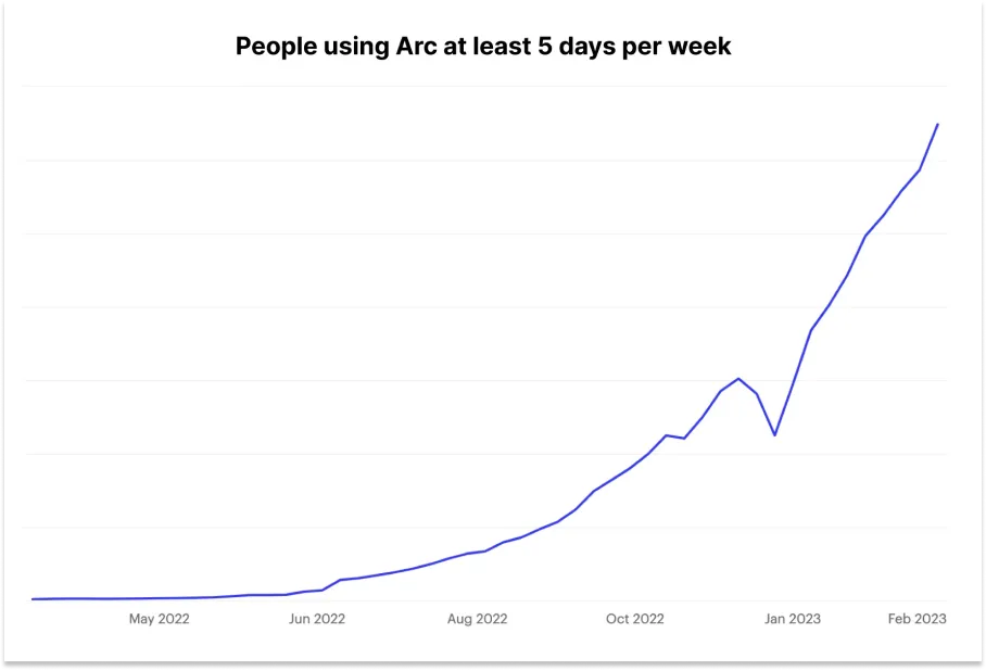 Arc越是挑战极限,人们越是谈论它并与朋友分享它,它就越是成长。Josh分享了一张图表,显示每周至少有5天使用Arc的人数(尽管他没有分享实际数字),而且斜率越来越陡。