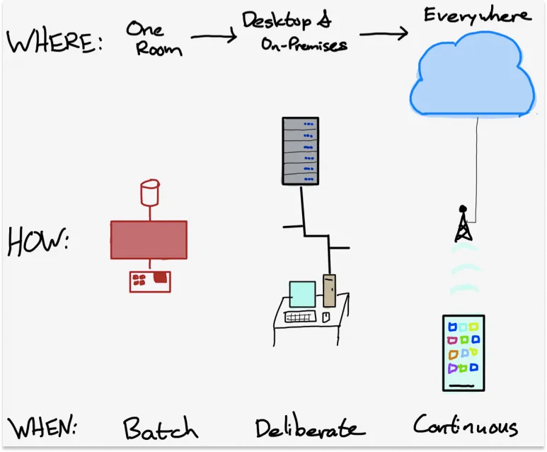 “值得注意的是,”Thompson观察到,“当前的环境似乎是所有这些变化的逻辑终点:从批处理到连续计算,从不同房间的终端到口袋里的电话,从磁带机到全球各地的数据中心。从这个角度来看,个人计算机/本地服务器时代只是一个明确定义范围两端之间的垫脚石。”