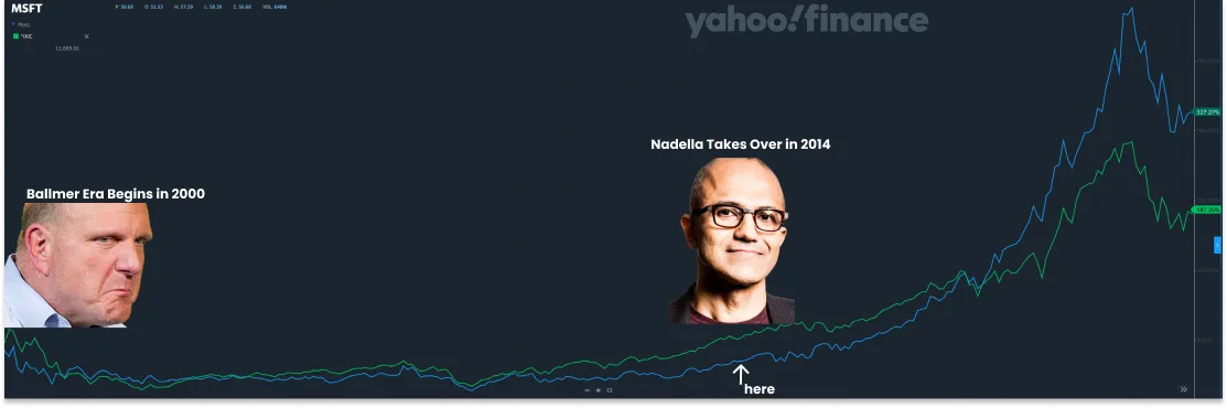 在Steve Ballmer领导下的黑暗岁月之后, Satya Nadella的微软是另一个光景。你可以从股票价格中看到这一点。在Ballmer领导的14年期间,MSFT的表现低于纳斯达克指数,而Nadella在过去9年里已经弥补了这一点。