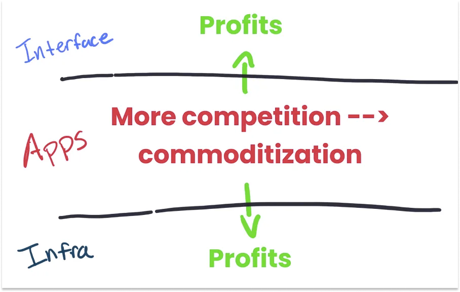 我认为,应用程序之战的价值将在两个阶段显现:下面和上面。应用程序层的激烈竞争将创造可在基础设施层(下图)和界面层(上图)获取的价值。