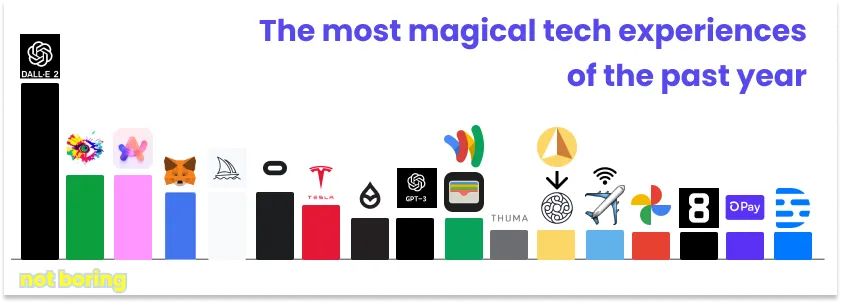 并不是只有我一个人这么认为。当我在Twitter上询问人们在过去一年中使用科技产品的最神奇体验时,Arc排在第二位,与Stable Diffusion并列,仅次于DALL-E 2。浏览器与生成性人工智能混合在一起了!