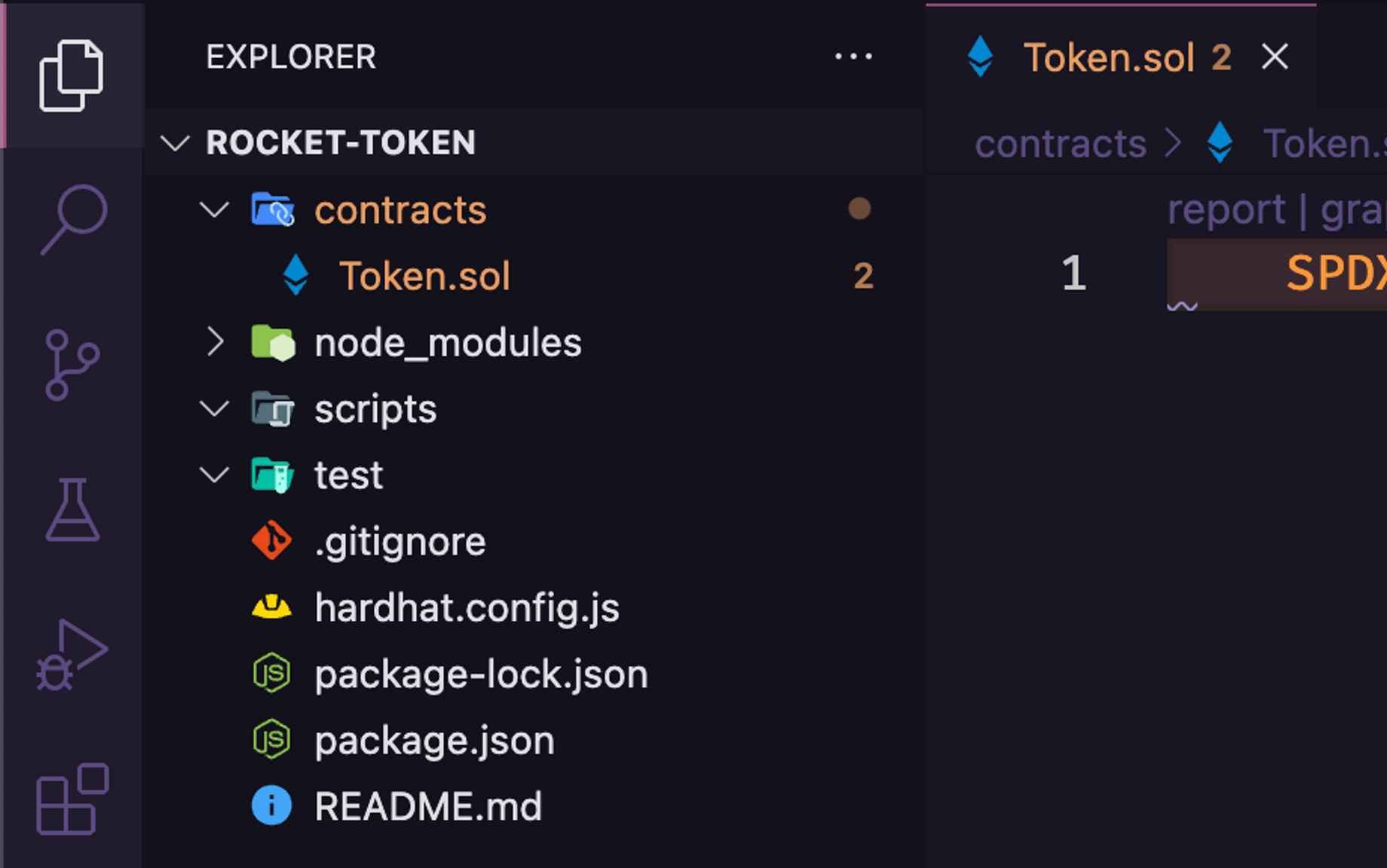 安装OpenZeppelin的合约之后,我们需要整理项目文件夹,从contracts、scripts和test中删除不必要的内容。清理完项目结构后,我们将在contracts文件夹内创建一个新文件Token.sol。